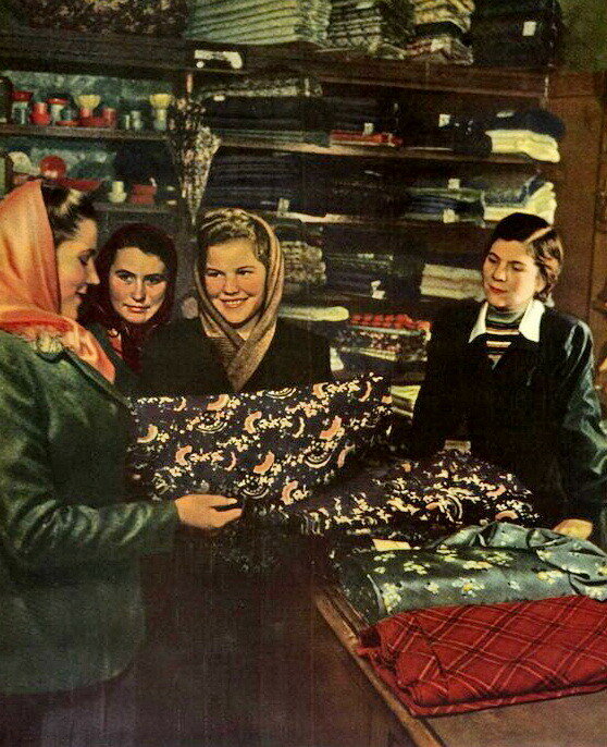 Отрез дарили не только на платье. Но и сатин на постельное бельё. Или портьерную ткань на шторы. Конечно, старались что-нибудь этакое подарить. Гипюр например, страшный дефицит был. Или плюш. Тюль тоже был в дефиците — хороший подарок. Может я ошибаюсь, но мне кажется, что в СССР готовых штор в принципе не было. По крайней мере мы все время самостоятельно подрубали ткань и пришивали много-много петелек для жутко неудобного карниза под названием «рельсы» (дерни деточка за веревочку, шторка и откроется)