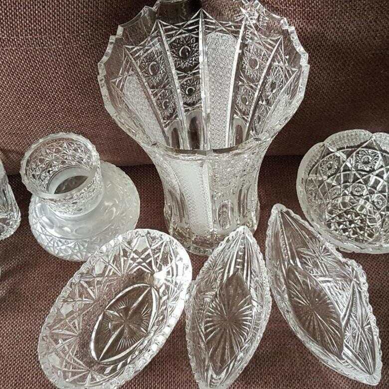 Я помню времена, когда хрустальная ваза была прямо подарком-подарком! Уровня свадьбы даже. Или юбилея, например. Стоил он прилично. И вполне себе уместно было дарить не только вазы, но и салатницы-конфетницы. И даже пепельницы из хрусталя. Очень популярна была «ладья», она на фото в нижнем правом углу.