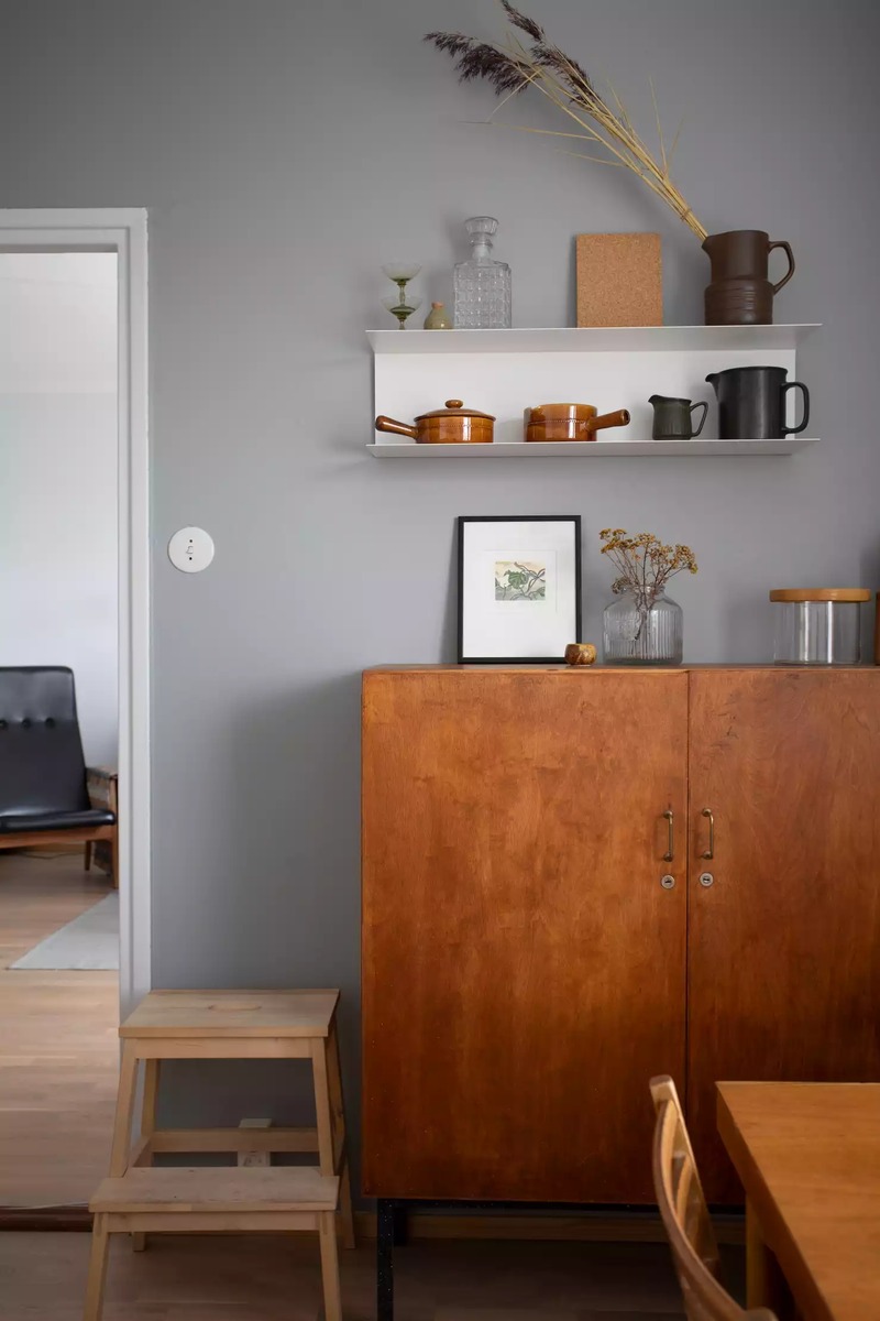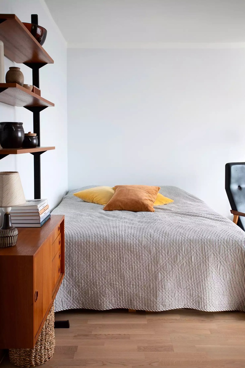 В этой же комнате, слева от дивана, располагается зона спальни. На небольшом открытом стеллаже — несколько книг и коллекция керамики