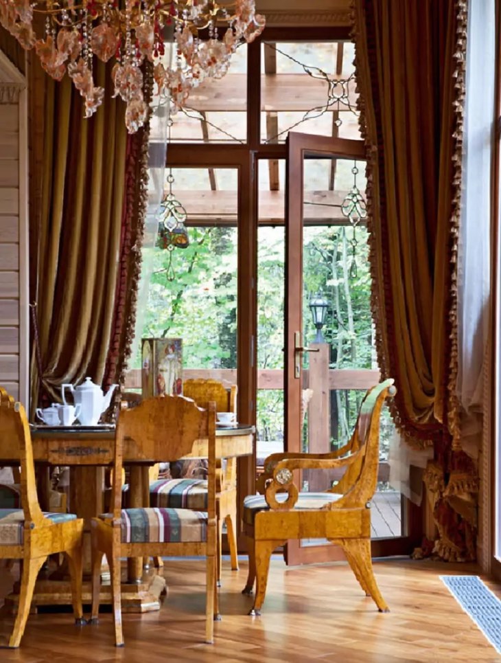 Для зоны отдыха выбраны диваны. Они поражают своим изяществом и изысканностью. Для столовой выбран стиль ампир. Такой же гарнитур украшает столовую. Его подарили Табакову друзья. Материал – берёза, выглядит мебель богато и дорого. Зудиной и её мужу так понравилась элитная мебель, что они начали собирать антиквариат.