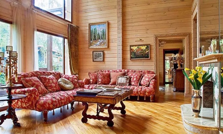 Отделка вся из дерева, натурального материала. Специальный состав и лак помогают дереву прослужить максимально долго и предотвратить гниение дерева. Для покрытия пола выбран паркет.