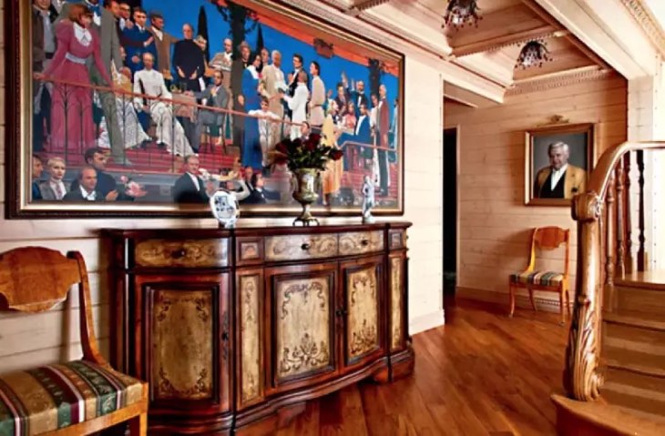 Главное украшение холла – роскошная картина, на которой изображён Олег Павлович в окружении любимых артистов, рукоплещущих своему руководителю. Художественное полотно повесили над антикварным комодом из карельской берёзы с радиусными боковыми дверцами и расписанными вручную фасадами.