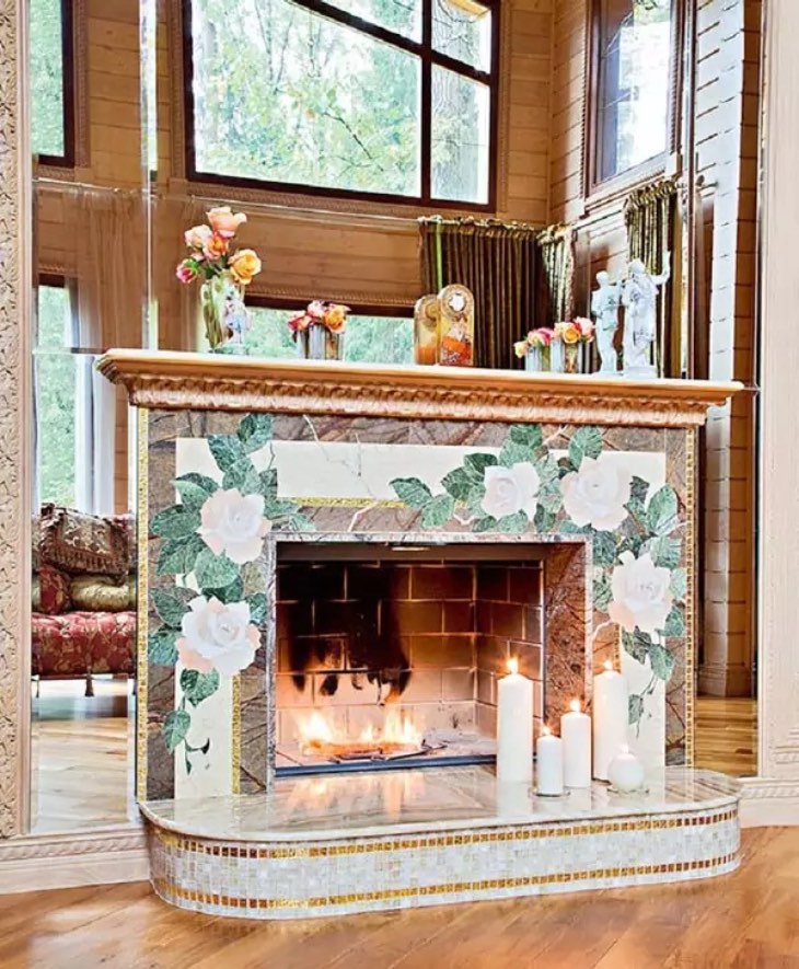 В гостиной есть и камин, его установили на фоне зеркальной стены на подиуме из мрамора с красивым природным рисунком. Возвышение декорировали бежевой мозаикой и золотыми вставками. Каминную полочку украшает мраморная статуэтка Олега Табакова
